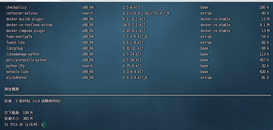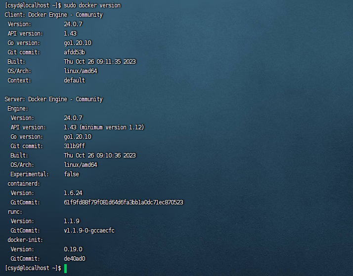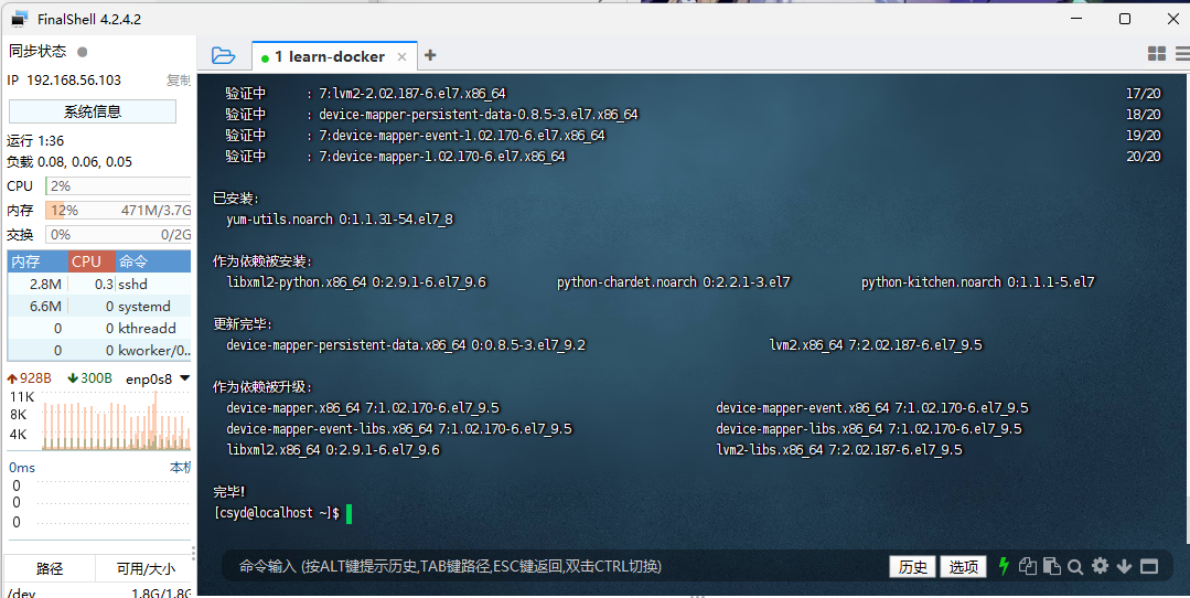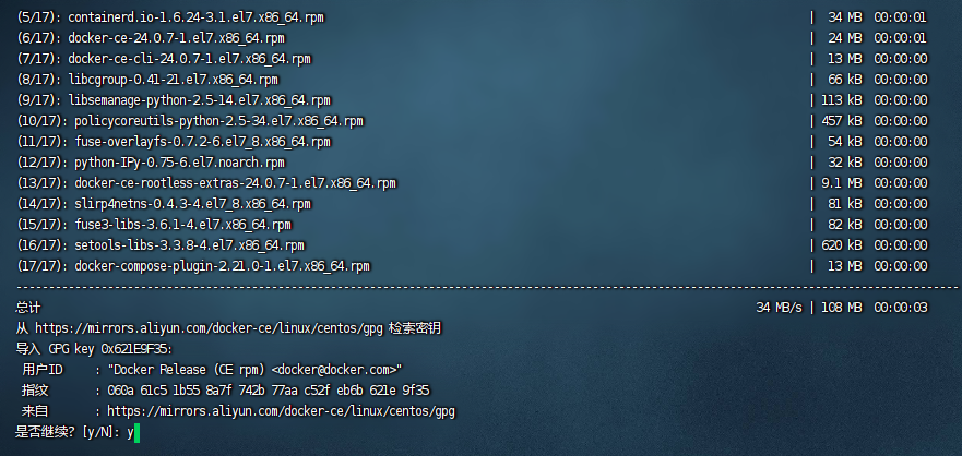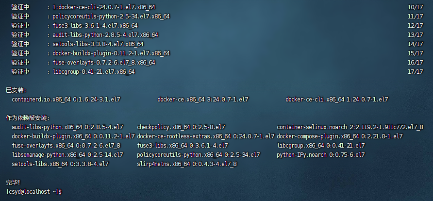 # (一) 我理解的Docker ---------- - 首先,我们学习Docker前第一句知道的话就是,Docker是个容器。在我的理解中,它就是一个大的积木箱子,里面的每一个小积木就是一个安装在Docker容器中的mysql、redis、应用服务等等。当我们需要使用哪一个服务的时候,就可以拿出这块积木,拼接在我们的项目上。 - 就像我们学过的虚拟机一样,可以在一台机器中建造多个虚拟机,完成不同的功能,Docker里面,就是一个又一个的迷你,轻量的虚拟机,这些虚拟机都是容器,装着不同用处的工具。在安装的时候,我们只需要一个镜像(比如mysql镜像),就可以执行命令,通过这个镜像安装mysql1、mysql2、mysql3等多个容器,更可以做不同的分工。 - 这样做的好处,可以让各种安装更便捷(只需要一个镜像即可用命令安装),功能上可以随意分离,占用空间更小 ,速度更快。 # (二) 安装Docker ---------- ## 1.环境 - 我是用Oracle VM VirtualBox搭建的虚拟机,系统是用Centos7,搭建过程请跳转到 [虚拟机【Oracle VM VirtualBox】搭建Linux系统【centos】](http://%E8%99%9A%E6%8B%9F%E6%9C%BA%E3%80%90Oracle) - 连接虚拟机我是使用的Final Shell,这样方便复制命令 ## 2.安装Docker ### Linux安装 - 先要卸载旧版本(如果没有,可以跳过) ```Shell sudo yum remove docker \ docker-client \ docker-client-latest \ docker-common \ docker-latest \ docker-latest-logrotate \ docker-logrotate \ docker-engine ``` - 安装需要的依赖工具,一些云服务器可能部分依赖是有的,再执行一次也不会有影响。我的Docker是虚拟机上安装,需要都安上 ```Shell sudo yum install -y yum-utils device-mapper-persistent-data lvm2 ``` - 完成  - 添加镜像源到yum,这里使用阿里云的镜像,能快一点 ```Shell sudo yum-config-manager \ --add-repo \ http://mirrors.aliyun.com/docker-ce/linux/centos/docker-ce.repo ``` - 完成  - 更新yum软件包索引 ```Shell sudo yum makecache fast ``` - 完成  - 安装Docker相关服务(docker-ce(社区版)docker-ee(企业版)) > **containerd.io** > 是Docker容器运行时的核心组件之一,它负责管理和运行容器。它提供了容器的生命周期管理、镜像管理、网络管理等功能。 > **docker-ce** > 是Docker Community Edition的缩写,是Docker的社区版本。它是一个开源的容器化平台,提供了构建、发布和运行容器的工具和服务。广义来说,docker-ce包含了dockerd(Docker守护进程)、docker命令行工具、docker-compose等组件;狭义上来讲,docker-ce 是与 docker containerd.io、docker-ce-cli 并列的服务组件。 > **docker-ce-cli** > 是Docker Community Edition的命令行工具(command line)。它提供了与Docker守护进程进行交互的命令行接口,可以用于管理和操作Docker容器、镜像、网络等。 ```Shell sudo yum install docker-ce docker-ce-cli containerd.io ``` - 确认一下,输入y,回车  - 再确认一下,输入y,回车  - 安装完成  - Docker设为开机启动 ```Shell sudo systemctl enable docker ``` - 完成  - 启动Docker ```Shell sudo systemctl start docker ``` - 查看是否安装成功 ```Shell sudo docker version ```  ### 云服务器安装 - 如果你是云服务器,可以直接参考 [搭建Docker](https://cloud.tencent.com/document/product/213/46000) # (三)卸载Docker - 这段是网上看的,没亲测过,以后有需要再试 ```Shell # 1.卸载依赖 yum remove docker-ce docker-ce-cli containerd.io # 2.删除资源 rm -rf /var/lib/docker rm -rf /var/lib/containerd # /var/lib/docker docker的默认工作路径 ``` **参考文章** https://zzzmh.cn/post/5be268cb18ac4816a20f0ae87580ea98 https://cloud.tencent.com/document/product/213/46000 https://blog.csdn.net/leah126/article/details/131871717 https://blog.csdn.net/Dontla/article/details/131886858