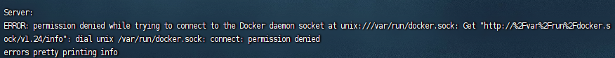 # 报错信息: ---------- ERROR: permission denied while trying to connect to the Docker daemon socket at unix:///var/run/docker.sock: Get "http://%2Fvar%2Frun%2Fdocker.sock/v1.24/info": dial unix /var/run/docker.sock: connect: permission denied  # 原因: ---------- 此时使用的是普通用户登录,报错告诉我们没有权限去连接Docker。 # 解决方案(两种): ---------- 1. 使用su root, 切换成root用户再执行 2. 在执行命令的前面加上sudo, 如:sudo docker info